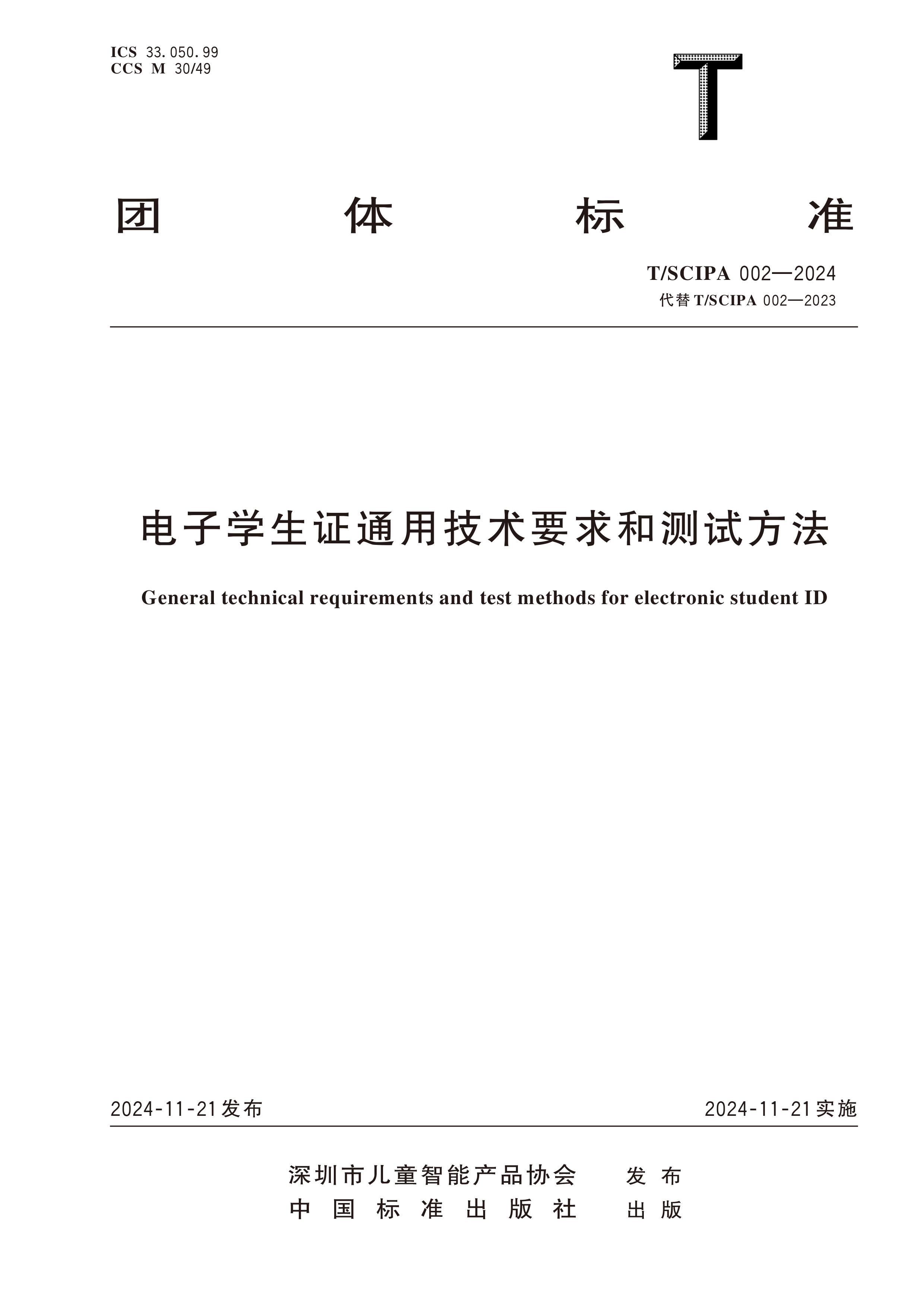 2 | 电子学生证通用技术要求和测试方法 | T/SCIPA 002-2024 | 43元 |